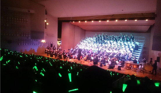 また今回の演奏会では、演奏の途中で字幕映写のための装飾用ウッドラック(発泡ウレタン製のパネル)が吊看板から剥離してステージ上に落下するという事故が発生し、演奏を一時中断する事態となりました。
